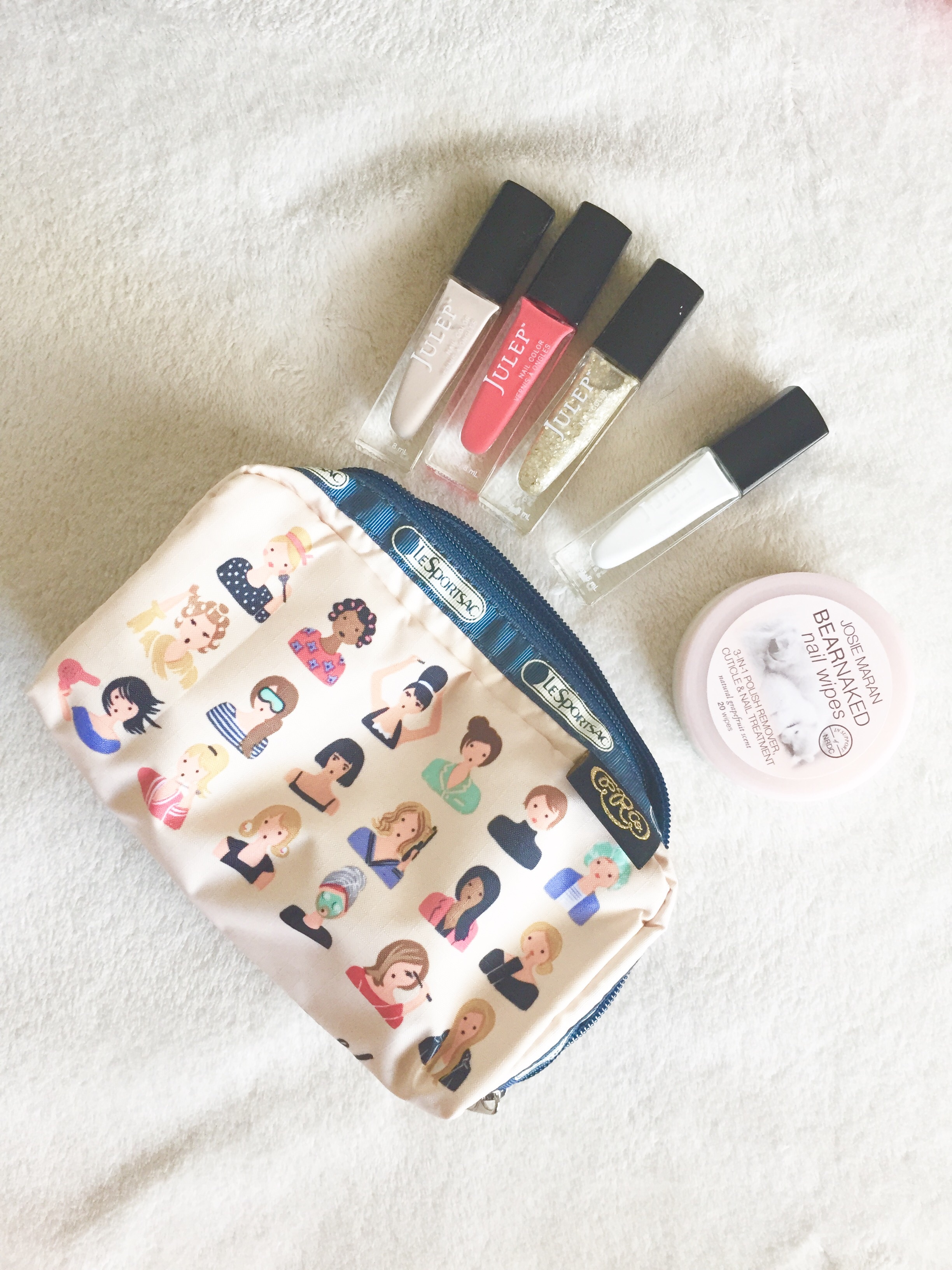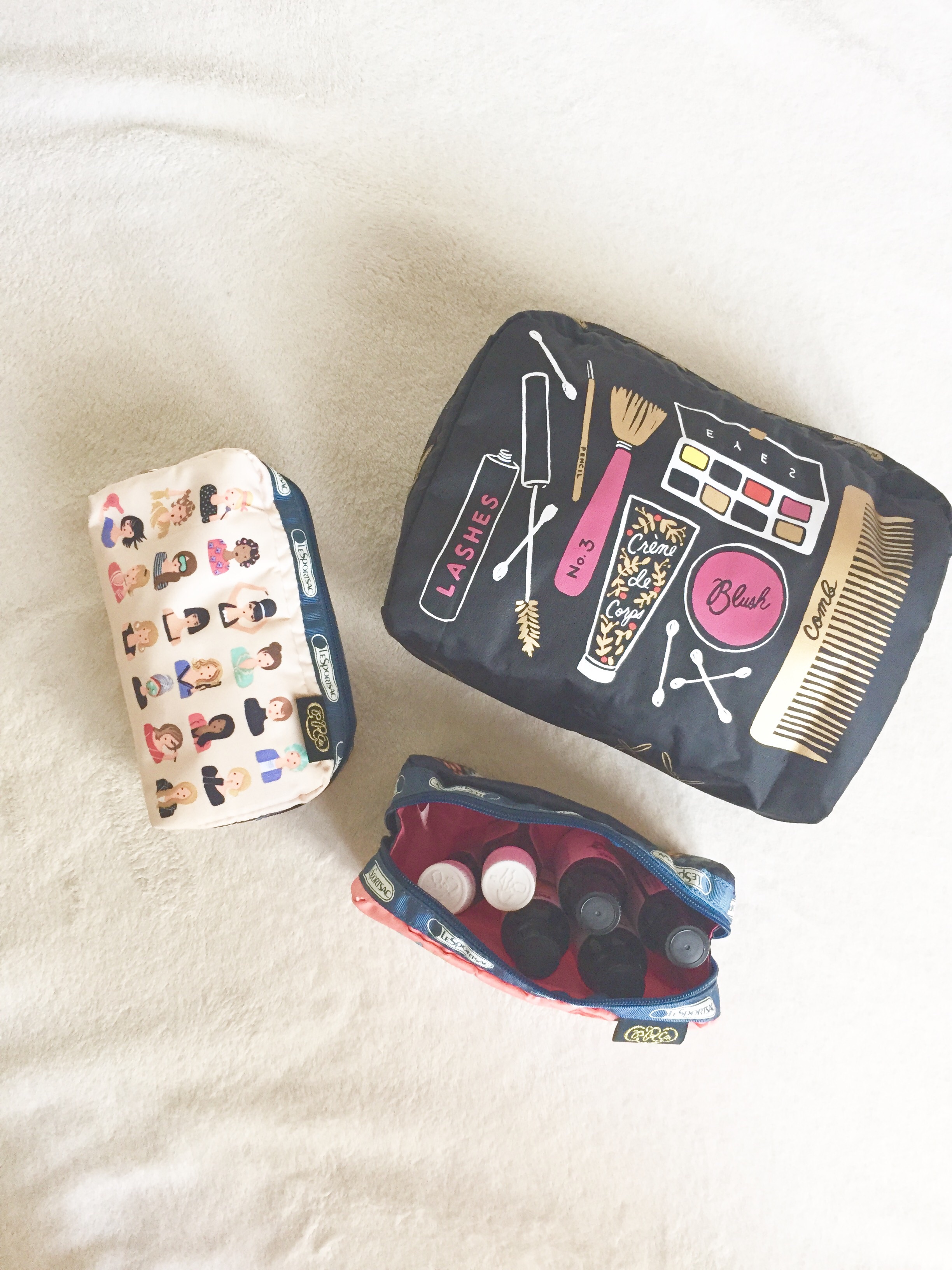 Now that I have switched all my essentials over to these bags, everything just feels more organized and accessible. The XL Rectangular Cosmetic Bag in Beauty Print holds ever single cosmetic item I own with plenty of room to spare. This pouch could even replace my Vera Bradley when traveling. The Rectangular Cosmetic Bag in Hello, Gorgeous holds all of my mani/pedi tools. It is literally the perfect size to hold all of my Julep polishes upright. Can we talk about how adorable the little ladies are in their before & after looks on the front and back? And the Rectangular Cosmetic Bag in Bonjour Print is now the home of my small essential oil collection. I’m sure down the line, I may add a few more EO vials so I’m glad there is still some room in this pouch.